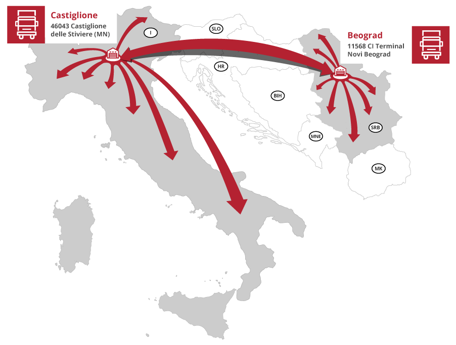 Robu prikupljamo po celoj Italiji (uključujući ostrva), sopstvenim voznim parkom od preko stotinu vozila koje u Italiji posedujemo, a onda iz našeg magacina u Mantovi, redovnim linijskim polascima utorkom i petkom, dopremamo do Beograda, odakle je distribuiramo po celoj Srbiji.